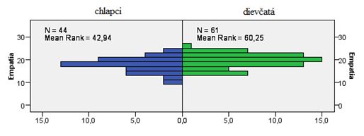 Pri hodnotení Empatie na úrovni jednotlivých položiek subškály boli zistené štatisticky významné rozdiely u troch z piatich položiek, ktoré sú zamerané na skúmanie uvedenej premennej. U všetkých troch položiek u dievčat sme zaznamenali vyššie skóre v porovnaní s chlapcami. V položke Je mi ľúto, keď sa niečo stane spolužiakom, štatisticky významne vyššie skórovali dievčatá o 0.64 bodu (U = 859.500; p = 0.001). V položke Viem požiadať spolužiakov o láskavosť, štatisticky významne vyššie skórovali dievčatá o 0.68 bodu (U = 892.000; p = 0.002) a v položke Počúvam spolužiakov, keď rozprávajú o svojich problémoch, štatisticky významne vyššie skórovali dievčatá o 0.57 bodu (U = 940.000; p = 0.006). Na úrovni položiek ostatných premenných sme nezaznamenali signifikantné rozdiely medzi výskumnými skupinami. Graf 1 predstavuje grafické znázornenie rozloženia skóre respondentov v premennej Empatia, kde skóre dievčat je koncentrovanejšie okolo stredu, kým skóre chlapcov je symetrickejšie rozložené.