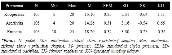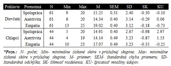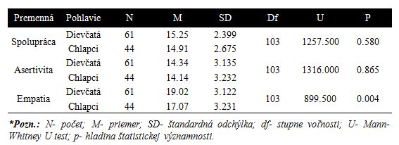 Pozorujúc hodnoty aritmetického priemeru, dievčatá prejavili vyššie skóre v porovnaní s chlapcami v každej z výskumných premenných. V premennej Spolupráca o 0.34 bodu, v premennej Asertivita o 0.2 bodu a v premennej Empatia dievčatá prejavili o 1.95 bodu vyššie priemerné skóre v porovnaní s chlapcami (Tabuľka 4).