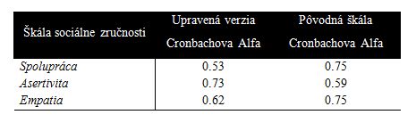 Následne upravená subškála Sociálne zručnosti pozostáva z 3 premenných/subškál: Spolupráca, Asertivita a Empatia. Jednotlivé subškály sú tvorené 4 položkami pre Spoluprácu, Asertivitu a 5 položkami pre premennú Empatiu. Pri administrácii žiaci odpovedajú na otázky pomocou miery súhlasu na škále Likertovského typu pozostávajúcej z 5 stupňov. V Tabuľke 2 uvádzame reliabilitu jednotlivých premenných. Reliabilita nástroja meraná Cronbachovým Alfa koeficentom celého nástroja bola uspokojivá (α = 0.740). Pre jednotlivé subškály koeficient reliability nadobúda: Spolupráca α = 0.53; Asertivita: α = 0.59; Empatia: α = 0.75.