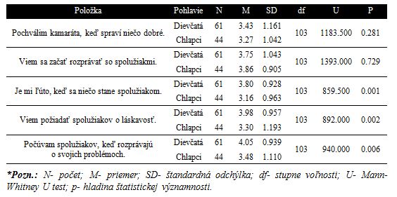 Štatisticky významný rozdiel sme zistili v premennej Empatia, kde prezentujeme signifikatné rozdiely vo výsledkoch u troch z piatich položiek (Tabuľka 5). Z položiek Je mi ľúto, keď sa niečo stane spolužiakom; Viem požiadať spolužiakov o láskavosť; Počúvam spolužiakov, keď rozprávajú o svojich problémoch, je zjavné, že ide o vonkajší prejav záujmu o iných ľudí. Dievčatá majú tendenciu viac počúvať iných, zaujímať sa o prejavy a pocity druhých a nemajú problém sa spýtať, keď niečo potrebujú. Auyeung, Wheelwright, Allison et al. (2009) pri testovaní emocionálnej inteligencie u žiakov prezentujú, že dievčatá majú vyššiu úroveň empatie ako chlapci. Podobne ďalšie výskumy prezentujú závery, že ženy sú empatickejšie než muži (Goldenfeld, Baron-Cohen, 2005; Hoffman, 1977, in Mlčák, 2010). Shieman (2005) túto skutočnosť vysvetľuje aj rozdielnou výchovou a socializačným procesom medzi chlapcami a dievčatami. U dievčat je počas vývoja kladený väčší dôraz na starostlivosť o iných. Empatia je spoločnosťou braná ako významná schopnosť potrebná hlavne na splnenie rodových rolí a vyššie v texte uvedených charakteristík. Chlapcov naopak spoločnosť povzbudzuje skôr k silnejším stránkam, čím často chlapci potlačujú svoje emocionálne prejavy. Dievčatá prijímajú rolu empatie lepšie a sú zároveň hodnotené pozitívne spoločnosťou, kým chlapci by boli hodnotení negatívne.