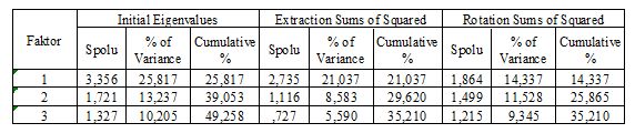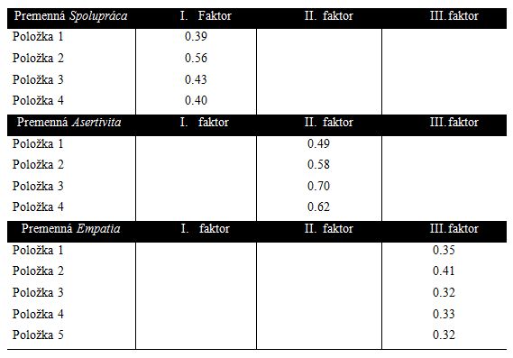 Vnútorná homogenita výskumného nástroja bola overená pomocou faktorovej analýzy (Principal Axis Factoring; rotácia Varimax; obmedzenie faktorov na 3 pomocou Eigenvalues), na základe, ktorej boli identifikované uvedené subškály (Príloha 2 1). Jednotlivé subškály sú sýtené faktormi od 0.32 až 0.70 (Spolupráca: 0.39-0.56; Asertivita: 0.49-0.70; Empatia: 0.32-0.41; Príloha 1 2) V jednotlivých subškálach sme nebrali do úvahy položky, ktoré nesýtia faktor na minimálnej hladine 0.30. Ako problematický faktor sa javí subškála Sebakontrola, kde položky tejto subškály nedosahovali minimálne stanovené sýtenie faktoru (0.30). Z toho dôvodu subškála bola odstránená, čo si vyžaduje ďalšiu konštrukciu, či rekonštrukciu položiek.