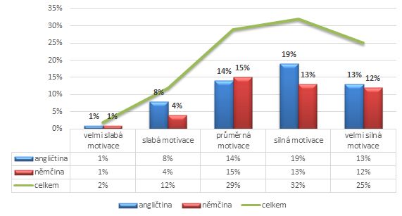 Podíváme-li se na rozvržení jazyků ve vztahu k dosažení motivační úrovně, můžeme konstatovat, že studenti angličtiny jako 1. cizího jazyka dosahují vyšší úrovně motivace. V případě silné motivace je to 19 % oproti stejnému stupni v němčině (13 %). Nejvyšším dosaženým stupněm vnímané úrovně motivace v němčině jako v 1. cizím jazyku je průměrná motivace (15 %) oproti takřka inverznímu stavu v angličtině (19 % u silné motivace). Avšak zatímco druhý nejvyšší stupeň motivace u studentů němčiny je silná motivace, u studentů angličtiny je na druhém místě průměrná motivace. V případě němčiny se tedy jedná o progresivní úroveň motivace (průměrná – silná – velmi silná motivace).