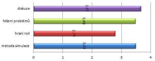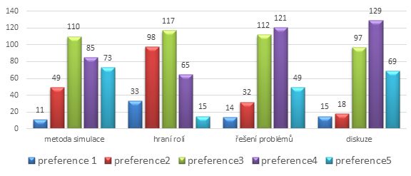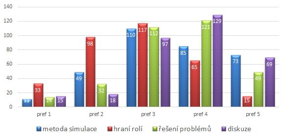 Preferenční úrovně u metody simulace jsou nejvíce konzistentní. Z grafu č. 5 vyplývá, že právě u metody simulace je zastoupena nejvyšší preferenční úroveň (hodnota č. 5).