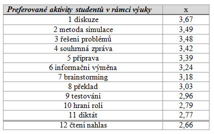 Další údaj, který jsme zpracovávali a interpretovali z Levinova dotazníku je preference vybraných učebních aktivit. Z Chaudronovy taxonomie jsme zvolili pro každý typ učební aktivity charakteristické metody či činnosti, které jsou též aplikovatelné ve výuce cizích jazyků.