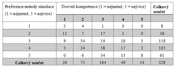 Platí tedy, že existuje přímá úměra mezi mírou studenty preferované metody simulace a úrovní jejich vnímané cizojazyčné kompetence.