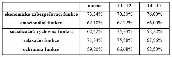 Skupina žáků ve věku 11-13 (47,37% ) a druhá skupina žáků ve věku 14-17 (52,63%) se významně ve svých výpovědích nerozcházely. Menší odchylky bylo možno pozorovat v odpovědích žáků starších, kteří vzhledem k vývojovému posunu odlišně (hůře) hodnotili socializačně-výchovnou a ochranou funkci. Největší rozdíly byly patrné ve výrocích „Doma si všichni věříme.“, „Mám často radost.“ a „Rodiče se o mě moc bojí.“. Starší žáci se hodnotili jako šťastnější, své rodiče hodnotili jako starostlivější a v otázce důvěry uvedli slabší hodnocení než žáci mladší. Odpovědi ani jedné skupiny se neodlišovaly významně od normy.