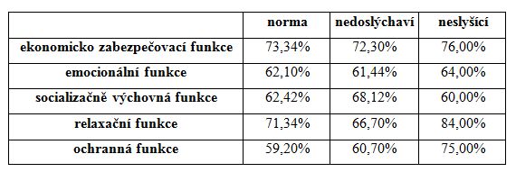 Porovnáním odpovědí žáků nedoslýchavých a neslyšících nebyly prokázány významné rozdíly v jednotlivých oblastech funkcí rodiny – viz tabulka č. 2. Bylo zjištěno, že neslyšící žáci hodnotí lépe ochrannou funkci o 14,3 % než žáci nedoslýchaví. Největší rozdíl však byl v oblasti relaxační funkce, kterou neslyšící žáci hodnotí lépe o 17,4%. Vzhledem k normě nevykazovali nedoslýchaví žáci rozdíly v odpovědích. Odpovědi žáků neslyšících přesahovaly normu s výjimkou oblasti socializačně výchovné, kde odpovědi odpovídaly průměru. Při komparaci jednotlivých položek byl nejvýznamnější rozdíl v položce z oblasti relaxační funkce „Doma společně obědváme.“. 69,2% nedoslýchavých žáků s tímto výrokem naprosto souhlasilo a 0% spíše souhlasilo, přičemž v 100% naprosto souhlasili žáci neslyšící. Tento výsledek přičítáme nerovnoměrnému vzorku respondentů. Skupina nedoslýchavých žáků tvořila 73,68% respondentů a 26,32% bylo respondentů neslyšících.