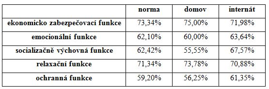 Žáci žijící doma tvořili 42,11% respondentů a žáci pobývající na internátu 57,89%. Doma bydlí 50% nedoslýchavých a 50% neslyšících žáků. Na internátu bydlí 90,9% žáků nedoslýchavých a všichni žáci mají slyšící rodiče. Komparací jednotlivých hodnocení funkcí rodiny nebyly zjištěny signifikantní rozdíly v odpovědích. Největší rozdíl byl v hodnocení socializačně výchovné funkce, kdy žáci žijící na internátě hodnotí tuto funkci o 12,02% lépe než žáci bydlící doma. Při porovnání jednotlivých položek v oblasti emocionální funkce bylo zjištěno, že konfliktní situace se vyskytují častěji u žáků, kteří bydlí doma, než u těch, kteří bydlí na internátu. 45,5% respondentů, kteří žijí na internátu s výrokem „Doma se nehádáme.“ naprosto souhlasilo a 27,3% spíše souhlasilo. Přičemž z žáků, kteří bydlí doma, s tímto výrokem naprosto souhlasilo 12,5% a spíše souhlasilo 25%. Další významný rozdíl se objevil ve funkci socializačně-výchovné, konkrétně položce „Doma si se všemi povídám.“ S tímto výrokem naprosto souhlasilo 90,9% žáků ubytovaných na internátu a spíše souhlasilo 9,1%. Přičemž žáci žijící doma tento výrok za naprosto pravdivý uvedli pouze v 50% a spíše s ním souhlasilo 12,5%. Žáci žijící na internátu uvedli, že naprosto souhlasí s výrokem „Mám často radost.“ v 72,7% a spíše s ním souhlasilo 18,2%. Žáci žijící doma s tímto výrokem naprosto souhlasili jen v 37,5% a spíše s ním souhlasilo taktéž 37,5%. Pokud sečteme výroky žáků žijících na internátu a doma, zjistíme, že jako šťastnější se hodnotí o 15% žáci na internátu. Nejvíce se rozcházeli ve výroku „Rodiče se o mě moc bojí.“ Naprosto souhlasilo s tímto výrokem 27,3% žáků bydlících na internátu a spíše souhlasilo 18,2%, Oproti tomu naprosto souhlasilo 50% žáků, kteří bydlí doma a spíše souhlasilo 37,5%. Je tedy patrné, žáci bydlící doma vnímají své rodiče jako starostlivější.