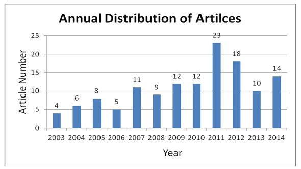 The annual distribution of research articles helps to reveal general developmental situation of a certain topic. Hence, the first step is to count the number of articles about early intervention from 2003 to 2014 in mainland China according to years. Results as shown in figure 1.