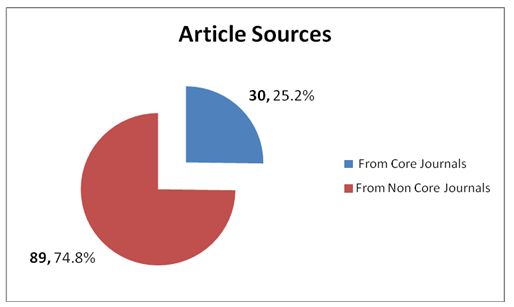 Furthermore, classify the 119 published journal articles by journal level which means core journals or non-core journals and count the number. Results are shown as figure2.About three quarters of all articles are from non-core journals with the article number of 89 and relatively only 30 articles are from core journals, which indicates that the quality of articles about EI need to be improved.