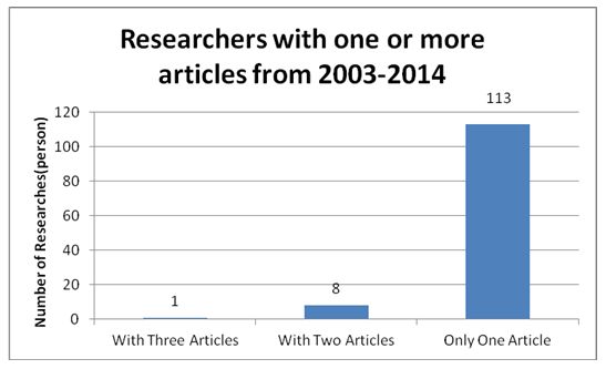 Count article numbers of different authors among the 132 articles by regarding leading author as the criterion. The results are shown in figure3. Only one researcher has published the most related articles (3, specifically) and just 8 authors has 2 articles. Authors with only one article are up to 113 persons, which take up more than 90% of the whole authors. This data is much higher than the estimated number of 60% according to Lotka's law[9] and indicates that the research contingent of EI in mainland China is unformed to be developed.