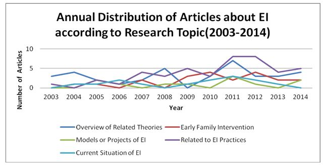 As seen from the above figure, articles about each topic have experienced a upward tendency in the 12 years and years from2010 to 2013 are research hotspot of EI. Researches related to EI practices and about overview of EI concepts have received sustained attention and this trend is likely to goes on in the future. Moreover, there is gradually increase of attention to early family intervention and models or projects of EI and the latter may be an important subsequent research focus.