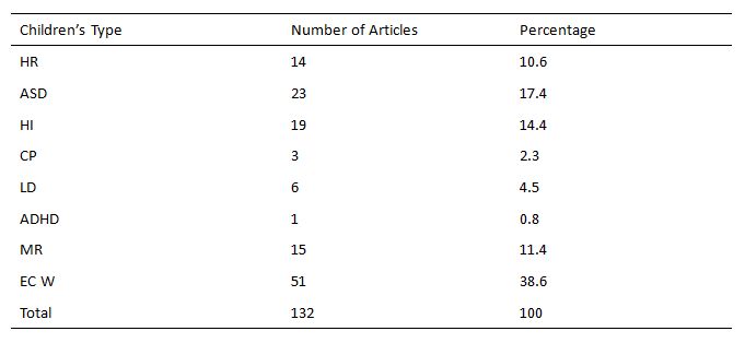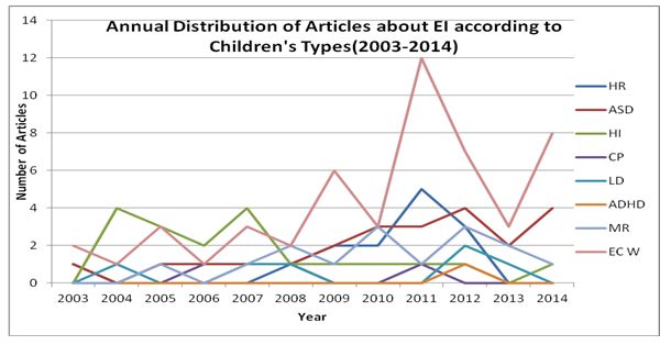 From the table above, about 40% of all articles aren’t targeted to any specific kind of children, but for all exceptional children as a whole. Besides that, children with ASD, HI, MR and HR are also considerable research objects in EI. Children with high-risk have received main attention from hospital personnel. And researches about EI for children with ADHD, CP and LD are comparatively less than other types above.