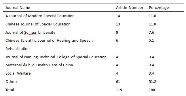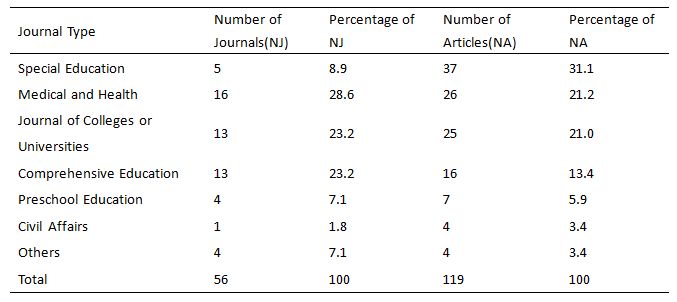 According to table 1, articles about EI are from various kinds of journals, including special education, preschool education, comprehensive education, medical and health care, civil affairs, and etc. seven types and 56 journals in total. Among them, journals of special education type are the most important source of related articles with the highest percentage of article number (31.1% specifically) and lower number of journals (5 specifically) which indicates the concentration of articles in one journal. Meanwhile, journal of medical and health and journal of colleges or universities also have large number of published articles, but these articles are relatively scattered to more than 13 journals. Journals of comprehensive education and preschool education have concerns about early intervention as well, but without high awareness. The most interesting is that one journal of civil affairs named “Social Welfare” published 4 articles about EI in total.