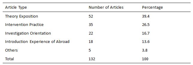 Classify the 132 related articles by five different article types, namely theory exposition type (exposition of theories and concepts about EI), intervention practice type (including intervention practices, summarization of intervention experience, case study and etc.), investigation orientation type(mainly about investigation of EI-related issues), introduction experience of abroad type and others. The number and percentage of different type articles are in table 3.