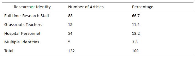 Categorize the identities of researchers of the 132 articles according to their working unit into the following four kinds: full-time research staff (including staff of specialized research agency, teachers in universities and colleges, undergraduate, master and doctor students); grassroots teachers(including staff in rehabilitation centre);hospital personnel and multiple identities which refers to researchers from more than one kind of the above.