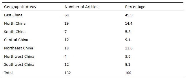 As seen from geographic distribution, the research about EI for children with special educational needs shows obvious regional variations. Classify the articles by the first signature unit referring to commonly used geographic areas of China. The results are shown in table 5.