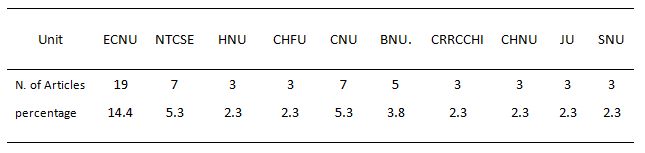 According to the above table,the main force of research about EI is located in East China followed by North China, Northeast China, Central China and Southwest China as the second place, while both South China and Northwest China are on the end of this ranking list. From the table, about 60% of all the articles are from East China and North China, and the former even accounts for one half of the total. This situation surprisingly coincides with the regional distribution of Chinese development of special education and related colleges and universities. And it also shows great the conspicuous regional variation of research about special education in mainland China.