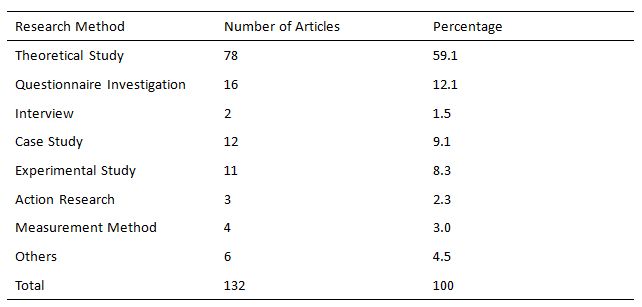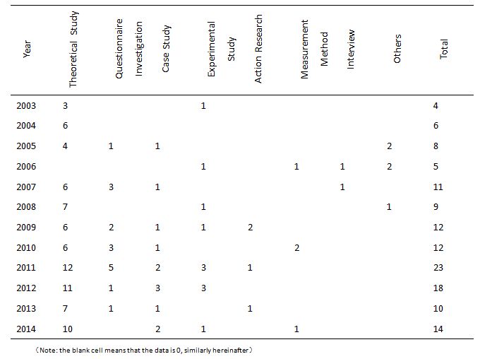 As seen from table 8, the research methods of EI in mainland China have gradually become rich and various. In recent years, the use frequency of some empirical methods like questionnaire investigation, case study and experimental study has been largely increased and more and more researchers start to use methods of interview, action research, measurement.