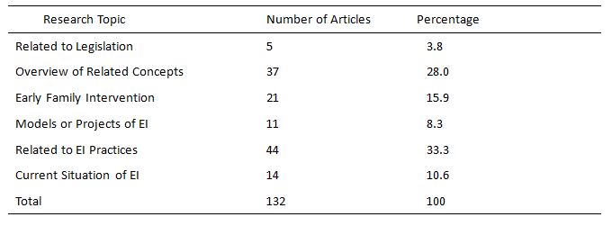 The subjects of this study are the Chinese articles which had been published between Jan.1,2003 and Dec.31,2014. By using the Leshan Normal University node of China National Knowledge Infrastructure (CNKI) and VIP Journal integration S Platform(VIP) as databases of article sources and “Exceptional Children/children with disabilities” “Early Intervention” as subject terms to search, we have found 132 useful articles, including13 master or doctor theses.