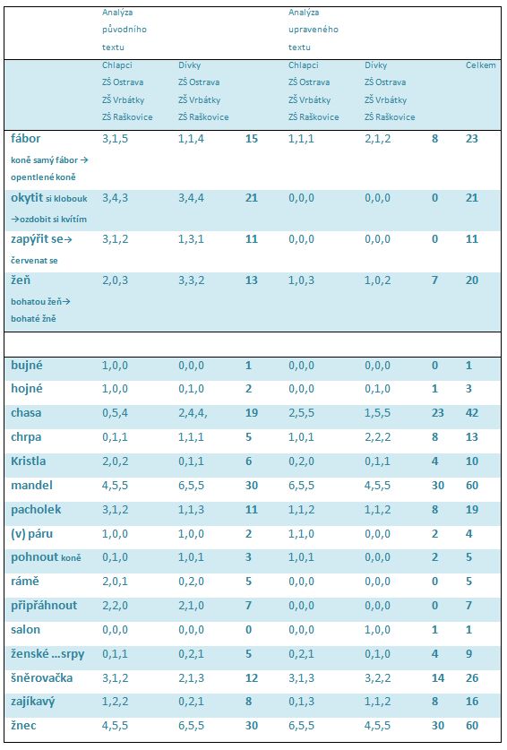 Žáci v 10 případech (poměr žáků čtoucích původní a upravený text je 6:4) označili jako neznámé jméno jedné z postav – Kristla, uváděli, že jde o domáckou podobu křestního jména, jehož oficiální znění neznají. 42 žáků (19:23) neznalo slovo chasa, z kontextu obvykle vyvodili, že jde o skupinu lidí, ale nebyli schopni vymezit její další znaky (lidé zaměstnaní v hospodářství, na statku nebo vesnická mládež). 19 žáků (11:8) neznalo slovo pacholek, při rozhovoru se ukázalo, že i další žáci si význam slova vyložili mylně, domnívali se, že jde o osobu mužského pohlaví, které koná něco špatného, nečestného (viz v současném jazyce možné využití daného výrazu jako nádavky). 26 žáků neznalo význam slova šněrovačka (12:14). Při rozhovoru postupně vyvodili z kontextu, že jde o součást oděvu, v několika případech však odhadovali souvislost s obuví na základě podobnosti mezi slovy šněrovačka a šněrování, šňůrka do bot. Obdobně 13 žáků (5:8) označilo jako neznámé slovo chrpa, po položení doplňujících otázek vyvodili, že jde o polní květinu, 16 žáků (8:8) neznalo adjektivum zajíkavý. V tabulce je zastoupeno také spojení ženské srpy (viz souvětí Ženci nesli srpy i kosy, ženské srpy a hrábě.) 9 žáků (5:4), kteří označili jako nesrozumitelný tento úsek textu, vnímali daný větný celek jako jednoduchou větu s několikanásobným předmětem a výraz ženské jako shodný přívlastek rozvíjející substantivum srpy. Přispěla k tomu jistě elize přísudku (…ženské /nesly/ srpy a hrábě). Žáci se domnívali, že ženské srpy by se mohly svou velikostí lišit od obdobných nástrojů pro fyzicky zdatnější muže.