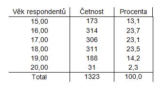 Věkové rozpětí respondentů se pohybovalo mezi 15 a 20 lety, což v současné době odpovídá věkovému rozpětí studentů středních škol. Průměrný věk respondentů byl 17 let.