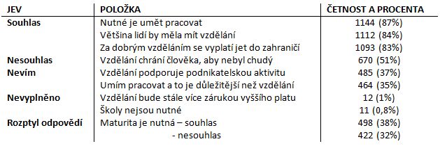 V rámci popisné statistiky byla zjišťována četnost odpovědí na jednotlivé položky. V tabulce č. 2 jsou uvedeny významné četnosti odpovědí u některých položek. U všech položek se směrodatná odchylka pohybovala v rozmezí od 0,72 do 1,17, což znamená, že mezi odpověďmi respondentů na jednotlivé položky nebyl velký rozptyl. Z uvedené tabulky je patrné, že pouze v jedné otázce je rozptyl odpovědí vyšší (téměř stejná skupina respondentů uvedla, že s výrokem souhlasí a nesouhlasí). Dále je zde patrné, že nejvyšší výskyt nevyplněných odpovědí se pohybuje u dvou položek okolo 1%, což znamená, že respondenti odpovídali na všechny otázky a nebylo potřeba dotazníky pro neúplnost vyřazovat. Za zmínku určitě stojí položky, na něž byla zaznamenána nejvyšší četnost souhlasných odpovědí. Významně vysoký souhlas (83 %) respondentů v položce Za dobrým vzděláním se vyplatí jet do zahraničí, je možné přisuzovat stále větší nabídce studia v zahraničí, která se k nám dostává, a také tomu, že studium v zahraničí je dostupnější. V médiích je možné se setkat s odborníky, kteří studovali v zahraničí, a v současné době jsou považování za úspěšné. Za zajímavé je možné považovat to, že 87 % respondentů vyjádřilo souhlas s výrokem, že Nutné je umět pracovat a téměř stejné procento (84 %) respondentů vyjádřilo souhlas s výrokem, že Většina lidí by měla mít vzdělání. Na první pohled by se tak mohlo zdát, že se jedná o protimluv, ale zřejmě tento fakt ukazuje na uvědomělost studentů. Studenti vnímají význam vzdělání, ale současně zastávají názor, že samotné vzdělání nestačí, že je důležité i umět pracovat. Zde je možné odkázat na teoretické vymezení problému (viz výše), kde se jasně ukazuje hodnota propojenosti vzdělání a práce.