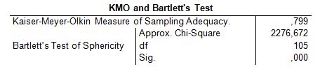 Pro seskupení položek a vytvoření proměnných byla použita Explorační faktorová analýza. Nejdříve byla ověřována vhodnost dat pro faktorovou analýzu. Jako první byla zjišťována míra Kaiser-Meier-Olkin (KMO) a bylo proveden i Bartlettův test.