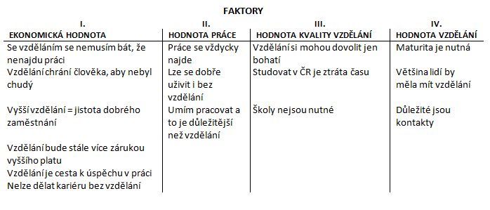 Již v předchozím výzkumu se ukázalo jako funkční pro další zkoumání využít faktorovou analýzu. Faktorová analýza umožňuje vytvoření shluků – faktorů, jež sytí určité položky. V našem případě se jednalo o vytvoření faktorů - „hodnot“ ve vztahu ke vzdělání. Tyto faktory pak bylo možné využít pro korelační analýzu a ověření výzkumných otázek a hypotéz. Z tabulky č. 3, je patrné, že data jsou vhodná pro faktorovou analýzu. Na základě tohoto zjištění bylo přistoupeno k extrakci faktorů. Byly extrahovány čtyři faktory, které vysvětlují téměř polovinu rozptylu v položkách. Pro lepší interpretovatelnost byly faktory rotovány metodou varimax. V tabulce č. 4 jsou pak zaznamenány jednotlivé faktory a položky, které je sytí. První faktor byl nazván jako „Ekonomická hodnota“. Položky, které tento faktor sytí, ukazují na hodnotu vzdělání, v duchu teorie Kellera a Tvrdého (2008) jako na pojišťovnu – tedy něco, co může přinést dobrou práci a tím i dobrý výdělek. Na první pohled se může zdát, že se jedná o čistě materialistický pohled na vzdělání, ale na druhé straně je dobré se zmínit o tom, že studenti si vlastně uvědomují spojitost mezi teorií a praxí a považují za nutné být dobře připraven pro praxi. Opět i na tomto místě je dobré odkázat na text výše (teoretické vymezení). Zde se jasně objevuje to, že vyšší vzdělání je vnímáno jako cesta do lepšího světa. Tento fakt se jeví jako trend konce 20. a začátku 21. století. Druhý faktor byl pojmenován jako „Hodnota práce“. Položky, které sytí tento faktor odkazují i na důležitou schopnost, a to je umět pracovat. Studenti zde vlastně připouštějí, že pokud by měli pouze vzdělání, nemuselo by tento fakt stačit. Zde se tak opět objevuje „nesoulad“ mezi prvním a druhým faktorem, o němž je pojednáno v textu výše. Třetí faktor byl nazván jako „Hodnota kvality vzdělání“. Položky, které sytí tento faktor ukazují na to, že si studenti uvědomují, že nestačí jen vzdělání, ale zajímá je i kvalita vzdělání. Čtvrtý faktor byl pojmenován jako „Hodnota vzdělání“. Zde jsou položky, které ukazují na význam vzdělání jako takového.