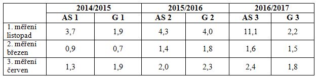 AS = Označení výsledků ve vazbě na metodu a rok měření: AS a G – metoda výuky, číselný údaj 1 až 3 prezentuje školní rok měření, tj. 2014/2015 – 1. měření atd. Totožné značení je použito také u Grafu 1.