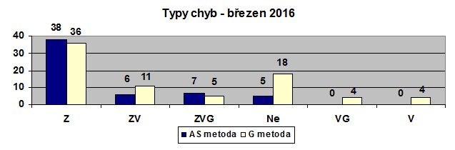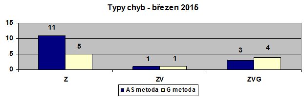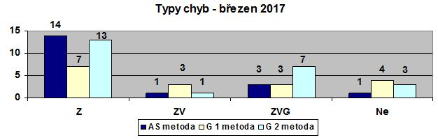 Z hlediska typologie chyb zaznamenaných při všech březnových měřeních lze konstatovat, že stále převažovaly Z chyby, 40 vyskytly se také ZV chyby a ZVG chyby, což značí, že žáci při čtení zvládali zohledňovat větší počet informačních klíčů. U žáků G metody se objevily častěji obtíže s provedením syntézy slova (viz Graf 2, údaj o počtu Ne chyb), což patrně signalizuje jisté problémy související s metodikou zvolené výukové metody.