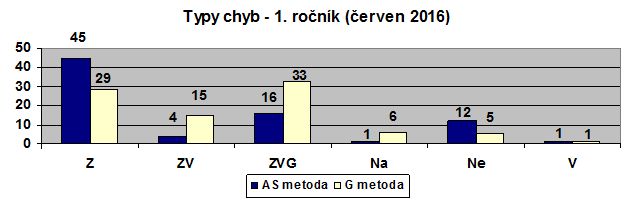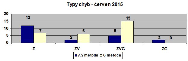 Žáci G metody se v červnu 2016 dopouštěli hlavně ZVG 53 a Z 54 chyb, ojedinělý nebyl ani výskyt ZV 55 chyb. Výsledky lze zobecnit: Žáci, u nichž byly zaregistrovány ZVG chyby, zpravidla při čtení chybovali méně a nevyskytovaly se u nich Z chyby. Oproti tomu žáci, kteří se ještě potýkali s obtížemi na úrovni vizuálního klíče (Z chyby), chybovali při čtení častěji a nedopouštěli se nejpokročilejších ZVG chyb. Podobné závěry platí také pro měření z let 2015 a 2017, při nichž výrazně převažovaly ZVG (viz Graf 6 a 7). V roce 2015 byly Z a ZV chyby registrovány téměř ve stejném rozsahu, zatímco v roce 2017 Z chyby výrazněji převažovaly.