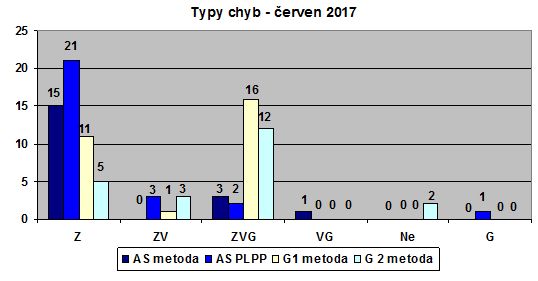 Z hlediska typologie chyb jsme se v červnu 2016 (viz Graf 5) i 2015 (viz Graf 6) u AS metody setkali nejčastěji se zkomoleninami, tj. Z chybami, 47 dále shodně následovaly ZVG chyby. 48 V červnu 2016 se poměrně často objevovaly Ne chyby, které zahrnovaly jak obtíže dětí spojené se syntézou slova, 49 tak nepřečtení kratších slov textu. 50 U skupiny žáků AS metody jsme do Grafu 7 vyčlenili údaje o počtu chyb, kterých se dopustili 3 potenciálně dyslektičtí žáci této skupiny se stanovaným PLPP. Výsledky analýz jednoznačně potvrdily platnost zavedeného opatření, neboť tito 3 žáci se při čtení sedmi vět dopustili celkem 26 chyb, z toho 21 bylo Z chyb. Tento výsledek potvrzuje obtíže s uplatňováním zrakového klíče při čtení. Stejní žáci dělali také ZV, ZVG a G chyby, což naopak i u nich dokládá rozvoj čtenářských dovedností (viz Graf 7). 51 Analýzy čtení zbývajících žáků AS metody měřených v červnu 2017 zcela potvrdily výsledky z předešlých let, tzn. dominovaly Z chyby, dále se objevily ZVG chyby a jedna VG chyba (viz Graf 7). 52
