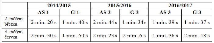 Poslední parametr, který byl v souvislosti se čtenářským výkonem registrován, je kvantitativního charakteru. Přestože eyetracker u každého záznamu čtení poskytuje automaticky údaje o čase čtení žáků, pojal náš výzkumný tým tato data pouze jako doprovodnou informaci. Uvědomujeme si, že s jejich pomocí lze způsob žákovského čtení lépe charakterizovat. Časové údaje o délce čtení ve školním roce 2014/2015 a 2015/2016 svědčí o tom, že žáci AS metody jak při březnovém, tak při červnovém čtení četli předložený text déle než žáci G metody, přičemž výraznější rozdíl byl naměřen vždy u 2. měření. V posledním roce se čas čtení obou skupin žáků výrazněji nelišil, a navíc se čtení žáků vyučovaných AS metodou zásadně zrychlilo, a to ve vztahu ke všem dosud provedeným měřením. Takovou enormní rychlost čtení se zdráháme vnímat příliš pozitivně, mohla by signalizovat nežádoucí zbrklost. Pokud bychom zvážili vyšší chybovost této skupiny dětí AS metody (průměr 2, 4 chyby na žáka oproti dřívějším 2,0 a 1,3), bylo by možné právě v rychlosti čtení spatřovat nebezpečí, které vyšší chybovost zavinilo. Rychlé přečtení textu navíc může negativně ovlivnit následně porozumění významu textu (k tomu viz dále). 58