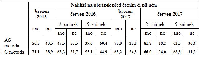 Tabulka 3 předkládá údaje 63 o čtení žáků jak ve školním roce 2015/2016, kdy se měření účastnilo více než 80 žáků, tak informace o čtení ve školním roce 2016/2017. 64 Výsledky analýz očních pohybů před započetím čtení a v jeho průběhu prokazují, že větší část žáků na přidružený obrazový materiál nahlíží v obou sledovaných metodách. Konkrétně 56,5 % žáků AS metody obrázkům věnovalo pozornost; u žáků G metody byl zaregistrován výraznější výskyt těchto očních pohybů směrem k ilustraci, a to u 71,1 % dětí. Data lze interpretovat následujícím způsobem: Žáci nejprve hledají různé mechanismy, které jim dodají jistotu, že text čtou správně a jsou schopni pochopit jeho význam; až červnové měření naznačilo další vývoj, který prokazuje, že klesá podíl těch dětí, které hledají oporu v ilustracích. Odhadujeme, že žáci získávají větší sebedůvěru, že techniku čtení zvládají. Na oba sledované snímky nahlíželi častěji žáci G metody, a to vždy více než polovina sledovaných – 68,3 % u 2. snímku a 55,1 % u 5. snímku. Výsledky potvrzují naši dříve zmíněnou domněnku, že text 2. snímku je obtížnější. Žáci obou metod si před čtením a v jeho průběhu ilustraci prohlíželi častěji než na 5. snímku, kde také při čtení méně chybovali. K očním pohybům žáků AS metody červnového měření je vhodné poznamenat, že dosažené výsledky naznačují výraznější jistotu dětí při čtení, protože větší část žáků čte text bez nutkání prohlédnout si obrázky, u 5. snímku je to více než 60 % dětí. Tento způsob, jakým si vykládáme četnost nahlížení dětí na ilustrace, do jisté míry dokládají data navazujících měření. Dominantní rozdíly ve výsledcích prvňáků G metody jsme v roce 2017 nezaregistrovali, tzn. opět mají častěji tendenci při čtení sledovat obrázky. Naopak prvňáci AS metody, u nichž nebyly řádně dodrženy počáteční metodické kroky užité metody, si byli při čtení natolik nejistí, že nahlížení na obrazový materiál, a to zejména u obtížnějšího 2. snímku, pokaždé značně převyšovalo počet očních fixací učiněných mimo text skupinou žáků G metody (březen 2017 – 75,0 % ku 65,2 %; červen 2017 – 81,8 % ku 66,0 %). Ze zjištění vysvítá, jak důležitou roli ve výuce sehrává učitel a jeho odborné kompetence. Potvrzují také, že výhledově by se na výsledky navazujících měření bylo možné dívat jako na přímou úměru dvou prvků: čím více si žáci důvěřují, že techniku čtení zvládli, tím méně se potřebují přesvědčovat o správnosti svého čtení.