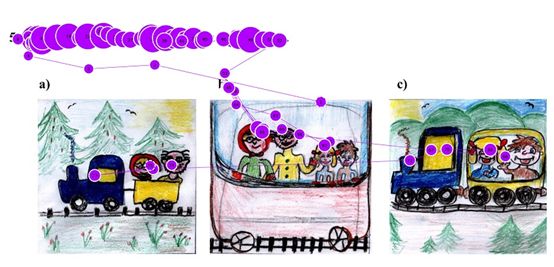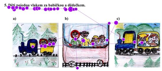 Při analýze správnosti žákovského porozumění textu jsme se zaměřili také na učiněné oční pohyby, jimiž byla provázena volba vhodné ilustrace k textu. Podobu užitého materiálu níže dokládáme dvěma ilustrativními snímky ze 3. měření (Snímek 3 a 4). Těmi současně dokumentujeme oční pohyby dvou čtenářů při čtení věty Děti pojedou vlakem za babičkou a dědečkem. Záměrně jsme vybrali snímky získané při čtení dvou chlapců, jednoho s užitou AS metodou (Snímek 3) a druhého s G metodou (Snímek 4). 66 Oba čtenáři jsou intelektově na stejné úrovni, a to v horní hranice nadprůměrného intelektu. Ani jeden z nich se na ilustrace před čtením či v jeho průběhu nedíval a čtení textu obou dětí na tomto snímku bylo bezchybné. Navíc záznam jejich březnového čtení prokazoval, že oba chlapci úspěšně dodržovali požadované strategie metodických kroků každé z metod. 67 Nejinak tomu bylo také u posledního měření. Hoch AShVK však na 5. snímku volil ilustraci správně, tedy c), zatímco chlapec GhRG při výběru chyboval a volil obrázek b). Záznam očních pohybů naznačuje, že oba čtenáři si všechny obrázky po přečtení textu prohlédli, avšak ani jeden z nich už zpět do textu nenahlédl, aby si ověřil správnost své volby. Při komparaci fixací vyobrazených na Snímku 3 a 4 zaznamenáváme zřetelný rozdíl – žák AS metody při čtení textu učinil méně fixací (přibližně 22) a ty trvaly kratší dobu. 68 Zato u žáka G metody je patrné, že fixoval každé písmeno a fixace byly delší.