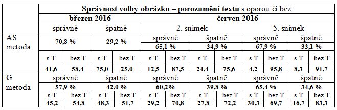 Také další parametr našeho výzkumu, kterým je porozumění textu, přinesl cenné výsledky. Děti při březnovém testování v roce 2016 zřetelně deklarovaly porozumění čtenému. Úspěšnost práce s textem v oblasti porozumění zvládali u daného měření lépe žáci AS metody, protože 80 % z nich zadání zdárně vyřešilo na obou zadávaných snímcích. Zato žáci G metody dosáhli o něco horších výsledků (u 1. snímku činila úspěšnost 76,8 %, u 2. snímku jen 73,2 %). Odlišné výsledky byly zjištěny při čtení totožného materiálu v roce 2015 a také 2017 a zaznamenaný stav přisuzujeme horšímu čtenářskému výkonu žáků AS metody, který se projevil v obou letech (srov. Tabulka 1). Žáci této metody selhávali výrazněji při výběru vhodné ilustrace na 1. snímku. Zdárně to v roce 2015 zvládlo pouze 56,3 % dětí a v roce 2017 necelých 70 % žáků AS metody, konkrétně 69,2 %, zatímco žákům G metody úkol nečinil zásadní problémy v roce 2015 (93,3 %) ani v roce 2017 (87,5 %). Porozumění textu v podobě správného vyřešení zadané úlohy prokázaly v březnu 2015 na 2. snímku shodně všechny děti obou metod. Totožný výsledek se o dva roky později nepodařilo dosáhnout, mírně lépe se dařilo žákům G metody, tj. 82,1 % správných odpovědí, ku 79,2 % správných řešení u AS metody. Tento rozdíl není statisticky významný a dosažené výsledky naznačují, že zjištěným rozdílům v parametru porozumění textu není potřeba přisuzovat stěžejní význam. Učiněný závěr stvrzují hlavně výsledky obou skupin žáků u 2. snímku.