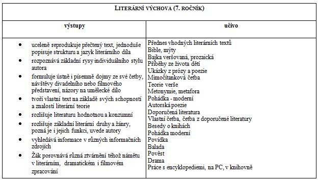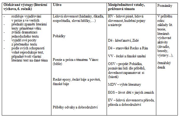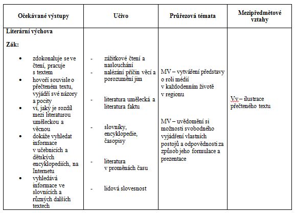 Při analýze školních vzdělávacích programech vybraných základních škol na Ostravsku, Opavsku a Vsetínsku v rámci projektu zmiňovaného v úvodu tohoto článku (Podpora společenství praxe jako nástroj rozvoje klíčových kompetencí) jsme se zaměřovali na výstupy, které mají za úkol rozvíjet čtenářskou gramotnost (zjednodušeně schopnost žáka porozumět textu, správně ho interpretovat a informačně zužitkovat) 11 , prohlubovat pozitivní vztah ke knize a čtenářství a také vztah ke kultuře. Jako specifický výstup jsme sledovali uplatňování mezipředmětových vztahů v literární výchově.