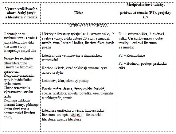 V jednom případě se o mezipředmětových vztazích na 2. stupni píše nejdříve v obecné charakteristice předmětu po jeho časovém a organizačním vymezení, ještě před průřezovými tématy a vymezením klíčových kompetencí, a to nesoustavně a výběrově pod názvem „Mezipředmětové vztahy“: „Dějepis – rozdělení slovanských jazyků, život pravěkých lovců (E. Štorch – dílo), Staré řecké báje a pověsti, Bible, nejstarší literární památky, romantismus, národní obrození, realismus – l. světová válka, 2. světová válka, Československo v době totality – exilová literatura a samizdat.“ Ve stejné škole se pak s mezipředmětovými vztahy setkáme ještě jednou v tabulkách vedle výstupů a učiva v sloupci nazvaném „Mezipředmětové vztahy, průřezová témata, projekty“ ve formě zkratek předmětů, průřezových témat a projektů s heslovitým uvedením tématu (viz Tabulka 2) 19 .