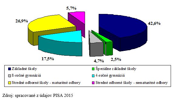 Posledná dostupná štúdia PISA z roku 2015 bola realizovaná v 72 krajinách, z toho v 35 krajinách OECD. Testovaniu boli podrobení žiaci vo veku od 15 rokov a 3 mesiace do 16 rokov a 2 mesiace (na Slovensku išlo o žiakov narodených v roku 1999 navštevujúcich siedmy alebo vyšší ročník). Testovanie sa realizovalo na rôznych typoch školských vzdelávacích inštitúciách v rámci troch hlavných oblastí gramotnosti (SR využila možnosť testovania aj v oblasti finančnej gramotnosti a tímového riešenia problémov). Na Slovensku sa do štúdie PISA 2015 zapojilo cca 6 400 žiakov z 292 vzdelávacích zariadení, čo predstavuje reprezentatívnu vzorku zo všetkých regionálnych jednotiek a typov škôl v SR. Percentuálny podiel zúčastnených žiakov podľa typu vzdelávacieho zariadenia uvádzame na Grafe 1.