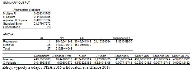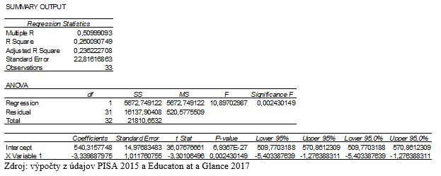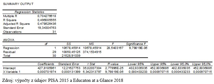 Na základe modelu regresnej analýzy sme skúmali vzťah medzi výsledkami žiakov z jednotlivých krajín OECD v testovaní PISA a vybranými finančnými a nefinančnými ukazovateľmi. V analýze sme vychádzali z priemerného získaného skóre jednotlivých krajín za všetky tri hlavné oblasti skúmanej gramotnosti (čitateľská, prírodovedná, matematická).