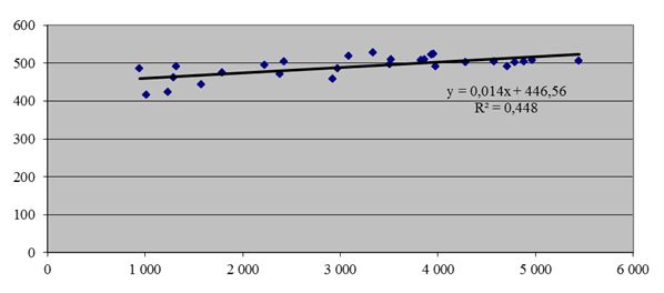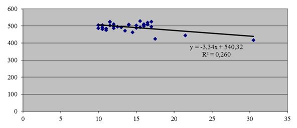 Za najmenej štatisticky významný vzťah, ktorý vyplynul z modelu sa ukázal medzi výsledkami žiakov v testovaní PISA a pomerovým ukazovateľom počtu žiakov na jedného učiteľa (korelačný koeficient 0,51, P-value a Significance F0,05). Vyšší počet žiakov na učiteľa môže ohrozovať individuálny prístup a riešenie potrieb jednotlivcov. Najvyššie hodnoty v danom ukazovateli vykazuje vzdelávací systém Mexika a Čile a najmenší počet žiakov na jedného učiteľa sme zaznamenali v Nórsku a Lotyšsku. Slovenská republika sa nachádza v pásme priemeru OECD.