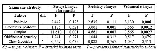 Predmetom výskumu bolo zistiť vplyv potencionálnych faktorov na postoje, vedo-mosti a predstavy žiakov z genetiky analyzovaných pred (pre-test) a po (post-test) pozoro-vaní genetického objektu drozofily (D. melanogaster). Následne po experimentálnom vplyve (post-test) bol evidovaný štatisticky významný vplyv experimentálnej skupiny žiakov mani-pulujúcich s drozofilou oproti kontrolnej skupine žiakov získavajúcich vedomosti a predsta-vy z genetiky s využitím učebnice biológie tradične v školskom prostredí (P˂0,01). Z ostatných faktorov bol ako signifikantný prediktor zaznamenaný iba vplyv pohlavia (P˂0,01), pričom chlapci sa javia byť voči dievčatám v rámci postojov k hmyzu v priemere úspešnejší. Atribút obľúbenosti genetiky v skupine manipulujúcej s vínnou muškou v školskom prostredí vykazoval priemerné skóre voči kontrolnej skupine rádovo vyššie, av-šak bez signifikantných vplyvov (P > 0,05). Interakcie medzi sledovanými faktormi nie sú uvedené, pretože boli bez štatistickej významnosti (P > 0,05) (Tab. 2).