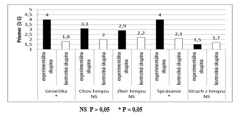Skúmaná bola aj analýza žiackych postojov k hmyzu a genetike (Graf 1), kde sme po experimentálnom vplyve (post - test) v školskom prostredí zaznamenali výrazné rozdiely medzi výskumnými skupinami v atribúte zameranom na obľúbenosť predmetu genetika (e = 4,0 , k = 1,8) a v otázkach zameraných na správanie hmyzu (e = 4,0 , k = 2,1 ). Zistené rozdiely v priemernom skóre postojov boli štatisticky významné (P˂0,05) v prospech skupiny žiakov pracujúcich s drozofilou oproti kontrolnej skupine, ktorá získavala poznatky z genetiky tradične s využitím učebnice biológie. Ostatné sledované dimenzie postojov (chov, zber a strach z hmyzu) boli v rámci skupín bez štatistickej významnosti (P > 0,05). Atribút stra-chu z hmyzu sa javí u žiakov experimentálnej skupiny po pozorovaní genetického objektu na nižšej kvantitatívnej úrovni (e = 1,5 ) ako v kontrolnej skupine žiakov bez priameho pozoro-vania genetického objektu (k = 1,7).