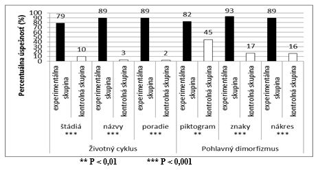 Okrem postojov k hmyzu boli vo výskumných skupinách respondentov analyzované aj predstavy hodnotených na základe žiackych kresieb modelového organizmu vínnej mušky. Predmetom skúmania bolo výsledné bodové skóre zo životného cyklu (štádiá, názvy, poradie) a pohlavného dimorfizmu (piktogram, znaky a nákres) genetického objektu (Graf 2). Z výsledného štatistického hodnotenia žiackych kresieb bola evidovaná vyššia úroveň predstáv v experimentálnej skupine žiakov vo všetkých kategóriách (P ˂ 0,05). Pri analýze životného cyklu vínnej mušky bolo zistená vyššia percentuálna úspešnosť u žiakov pri znázornení vývinových štádií (e = 79 % , k = 10 %, P ˂ 0,001), ich pomenovania v rámci vajíčka, larvy, kukly a dospelého jedinca (e = 89 % , k = 3 %, P ˂ 0,001) ako aj pri hodnotení správneho poradia vývinového cyklu (e = 89 % , k = 2 %, P ˂ 0,001). Obdobné výsledky boli zaznamenané aj pri znázornení fenotypových znakov pohlavného dimorfizmu, a to nákres piktogramu samca a samičky (e = 82 % , k = 45 %, P ˂ 0,01), znázornenie pohlavných znakov (e = 93 % , k = 17 %, P = 0,001) a kresba jedincov oboch pohlaví (e = 89 % , k = 16 %, P ˂ 0,001). Všetky skúmané predstavy boli v rámci experimentálnej skupiny po experimentálnom vplyve pozorovania pohlavných znakov jedincov a chovu vínnej mušky v školskom prostredí vysoko signifikantné (P ˂0,001). - vymazané
