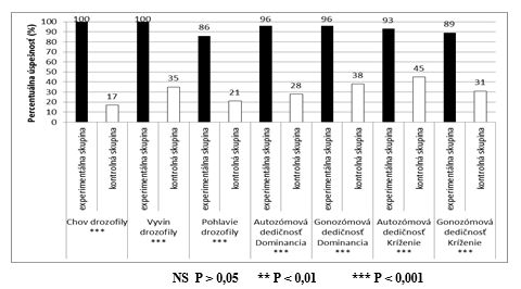 Posledným sledovaným atribútom bola úroveň žiackych vedomostí zameraná na sledované kategórie: chov, vývin, pohlavie drozofily, dominancia a kríženie v rámci autozómovej a gonozómovej dedičnosti. Bolo zistené, že osvojené vedomosti žiakov o vínnej muške, kríženia a dominancie sledovaných znakov sú v skupine pracujúcej s drozofilou na vyššej kvantitatívnej úrovni ako skupina, ktorá sa pozorovaní s genetickým objektom nezúčastnila (Graf 3). Percentuálna úspešnosť chápania všeobecných pojmov bola z genetiky v rámci autozómovej a gonozómovej dedičnosti pomerne vysoká. Dedičnosť na pohlavie vykazovala nasledovné hodnoty v rámci dominancie (e = 96%, k = 38 %, P ˂0,001) a kríženia (e = 89 %, k = 31 %, P ˂0,001). Podobne výsledky so štatistickou významnosťou boli evidované aj v rámci vedomostí o chove (e = 100 %, k = 17 %, P ˂0,001), vývine (e = 100 %, k = 35 %, P ˂0,001) a pohlaví (e = 86 %, k = 21 %, P ˂0,001) vínnej mušky. Uvedená skutočnosť bola pravdepodobne ovplyvnená jednoduchou manipuláciou s biologickým objektom pri chove a pozorovaní vývinu jedinca počas ontogenézy a jej následným pozorovaním dedičných znakov počas experimentov kríženia v školských podmienkach in vitro (Graf 3).