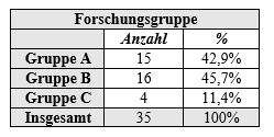 Wegen einer geringen Anzahl von Personen der Gruppe C, also der Laienöffentlichkeit, werden wir weiter nur die Forschungsgruppen A und B vergleichen.