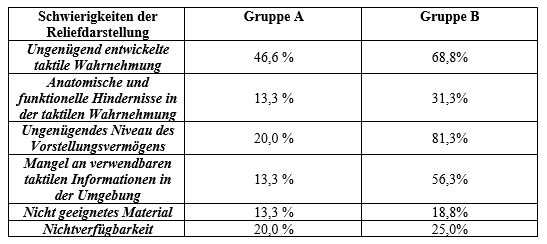 Neben dem Fehlen bestimmter Relief-Elemente werden auch die verschiedensten Schwierigkeiten im Rahmen der Reliefdarstellung benannt. Beide Gruppen stellen übereinstimmend eine ungenügende Entwicklung der taktilen Wahrnehmung sowie das bereits erwähnte Fehlen oder eine Nichtverfügbarkeit einer Reliefdarstellung fest. Die Fachöffentlichkeit sieht auch in hohem Maße das Problem in einem ungenügenden Niveau an Vorstellungsvermögen bei Personen mit Sehbehinderung.