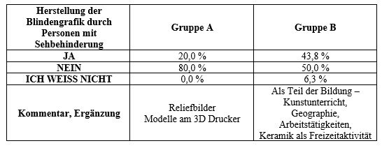 Ein weiterer Punkt betraf die Frage, ob Personen mit Sehbehinderung selbst Elemente der Blindengrafik herstellen. Die Ansichten der Gruppe A und B unterschieden sich mehr darin, ob sie sich an der Herstellung selbst beteiligen oder nicht.