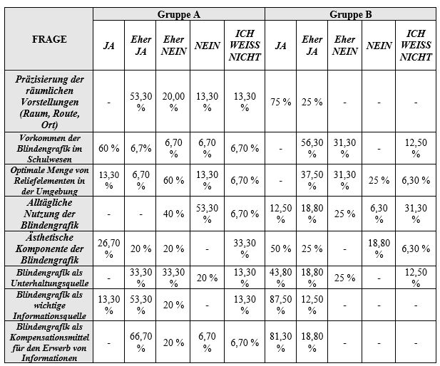 Aus der Sicht der Personen mit Sehbehinderung ist die Antwort auf die Frage nicht ganz eindeutig. Die Fachöffentlichkeit hat dagegen eine klare Vorstellung darüber, auf welche Art und Weise die Reliefgrafik die Mängel im Bereich des Informationserwerbs kompensiert und vermindert. Beide Gruppen sehen jedoch den größten Beitrag im Bereich der räumlichen Orientierung und der selbständigen Bewegung.
